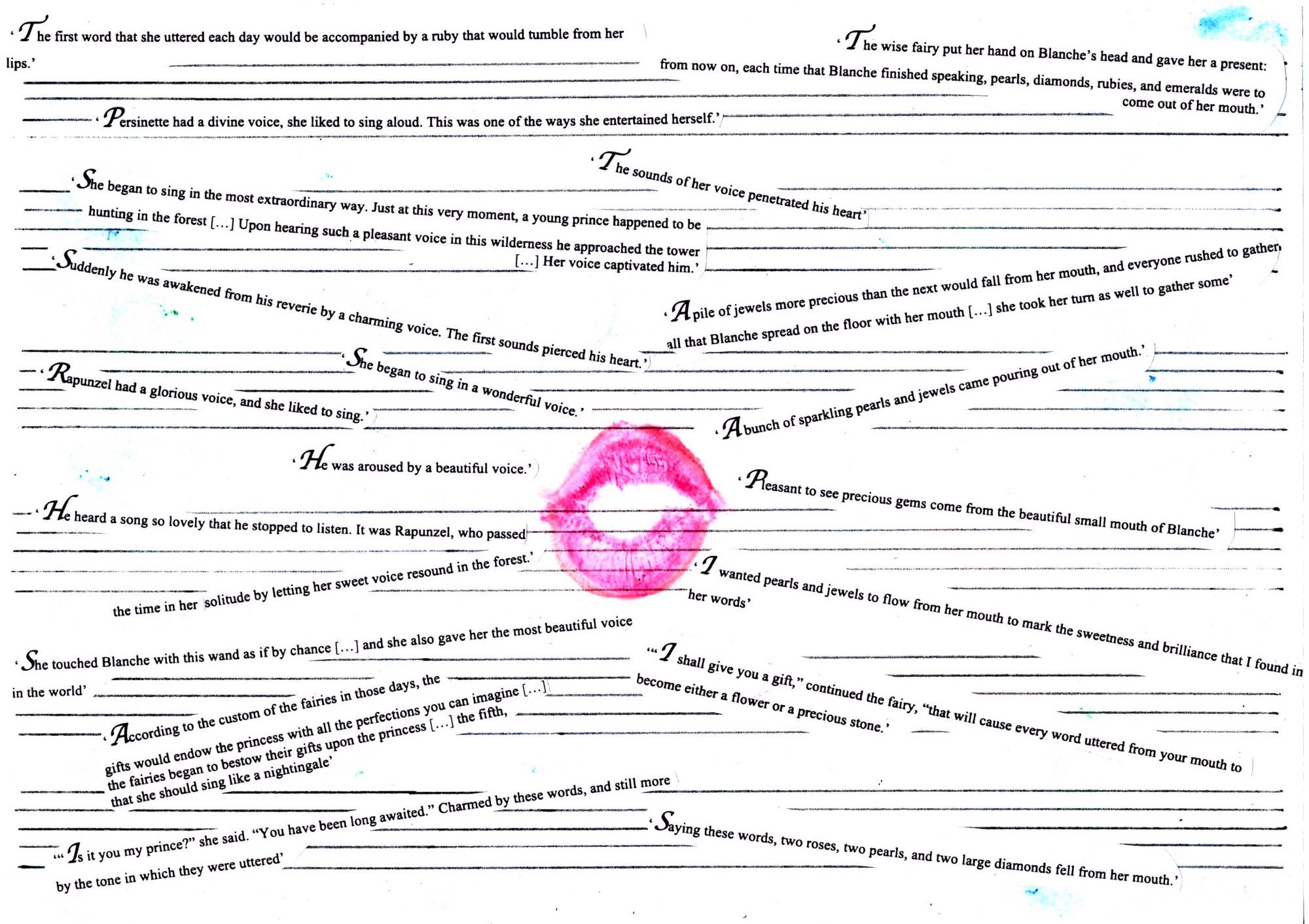 Sources in clockwise order: Jean de Mailly, “Blanche Belle” (1698), in Les illustres fées, contes galans (Paris: M.-M Brunet, 1698), Charlotte-Rose de la Force, “Persinette” (1698), in Les contes des contes (Paris: S. Bernard, 1698), Friedrich Schulz, “Rapunzel” (1790), in Kleine Romane, vol. 5 (Leipzig: Georg Joachim Göschen, 1790), Jacob and Wilhelm Grimm, “Rapunzel” (1857), No. 12 in Kinder- und Hausmärchen. Gesammelt durch die Brüder Grimm (Göttingen: Dieterich, 1857), Charles Perrault, “Sleeping Beauty” – “La belle au bois dormant” (1697), in Histoires ou contes du temps passé (Paris: Claude Barbin, 1697), Marie-Jeanne Lhéritier, “The Enchantments of Eloquence; or, The Effects of Sweetness” – “Les enchantements de l’éloquence; ou, Les effets de la douceur,” in Oeuvres meslées (Paris: J. Guignard, 1696), Charles Perrault, “The Fairies”— “Les fees,” in Histoires ou contes du temps passé (Paris: Claude Barbin, 1697).